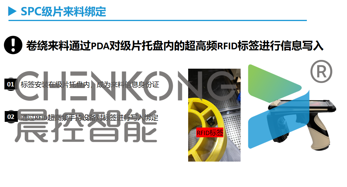 RFID 标签嵌入与数据绑定:在级片托盘内部嵌入 CK-TUS7321 RFID 标签,将来料信息身份证等关键信息通过RFID手持机写入其中。